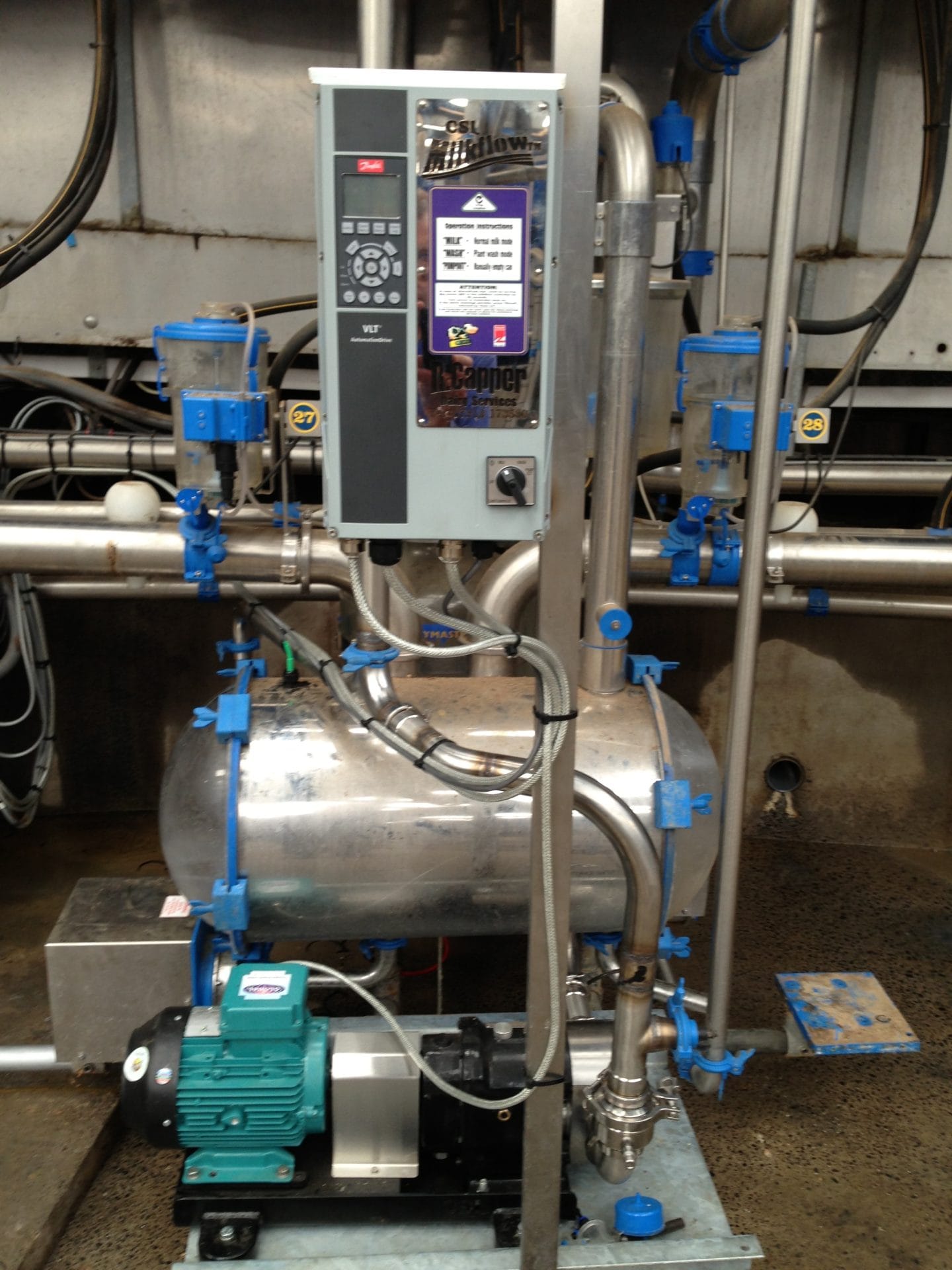 As more or less milk enters the receiving can, the CSL Milkflow controller varies the speed of the pump, maintaining a steady flow of milk through the plate cooler resulting in more efficient refrigeration of your milk, reducing cooling costs.